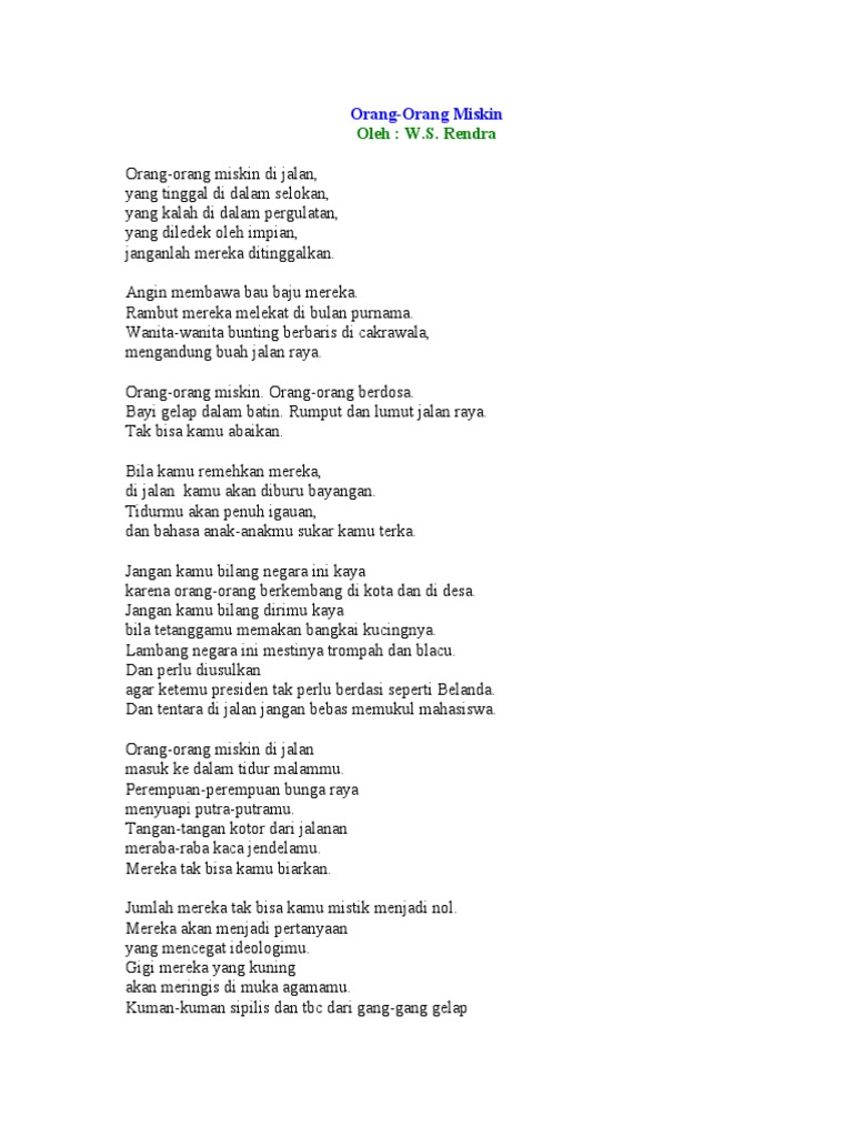 Puisi Aku Orang Miskin from imgv2-2-f.scribdassets.com Kumpulan puisi realitas kehidupan rakyat miskin di indonesia 2016. Berikut ini adalah puisi berjudul jiwa yang miskin, bagaimana cerita puisi tentang jiwa yang miskin yang diterbitkan berkas puisi. Semoga dapat membantu tugasmu juga ya untuk membacakan puisi di depan kelas. By arif nur setiawan 10 years ago 10 years ago. Kita sebagai orang tua menganggap anak merupakan sebuah anugerah dari tuhan yang menjadi buah hati kita selaku orang tuanya. Anak akan lebih senang dengan berbagai fenomena alam seperti hujan, pelangi, gunung, pantai, dan masih banyak lainnya. Demikian contoh puisi ayah dan ibu dari mulai 2, 3, 4 bait yang sudah kami berikan diatas. Berikut ini beberapa contoh puisi anak sd, smp dan sma yang bertemakan alam.